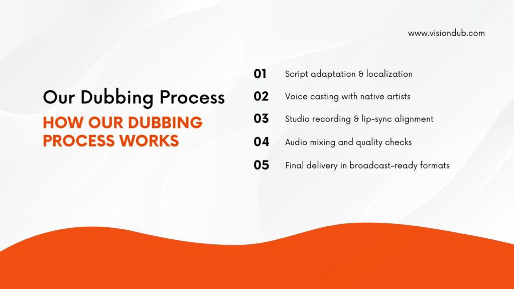 Every dubbed version preserves the original emotion, tone, and rhythm of the original audio while delivering clear dialogue in the new language. We prepare each video file for precise synchronization and reliable playback on streaming platforms.